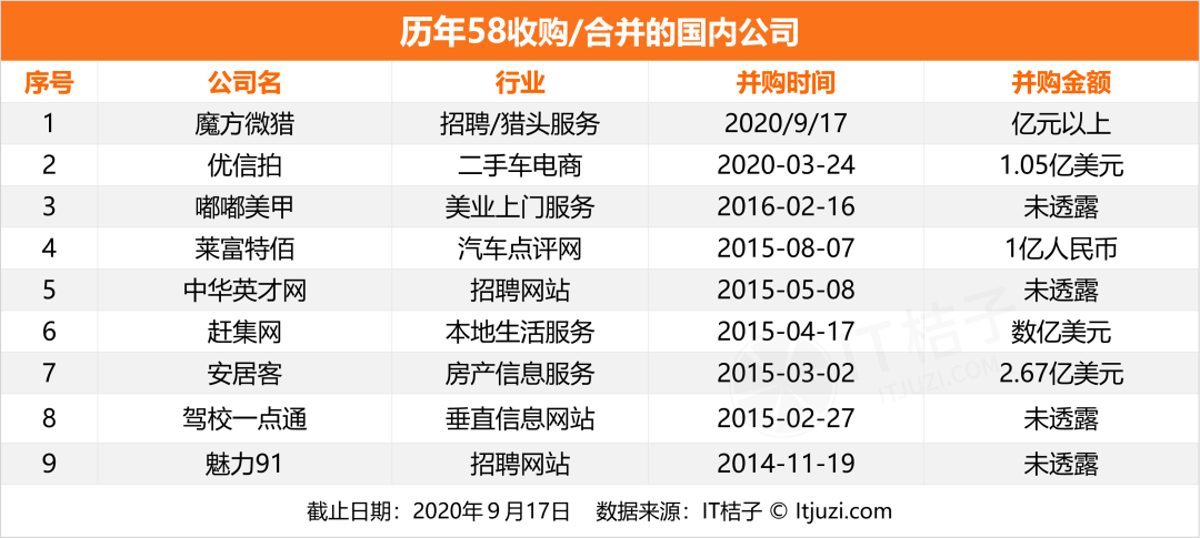 在招聘服务领域,2014 年58收购一家专注营业员招聘的网站「魅力 91」。2020 年 9 月 17 日,招聘网站「魔方微猎」被 58 同城并购,同时更名为「58 魔方」,原有管理团队不变。