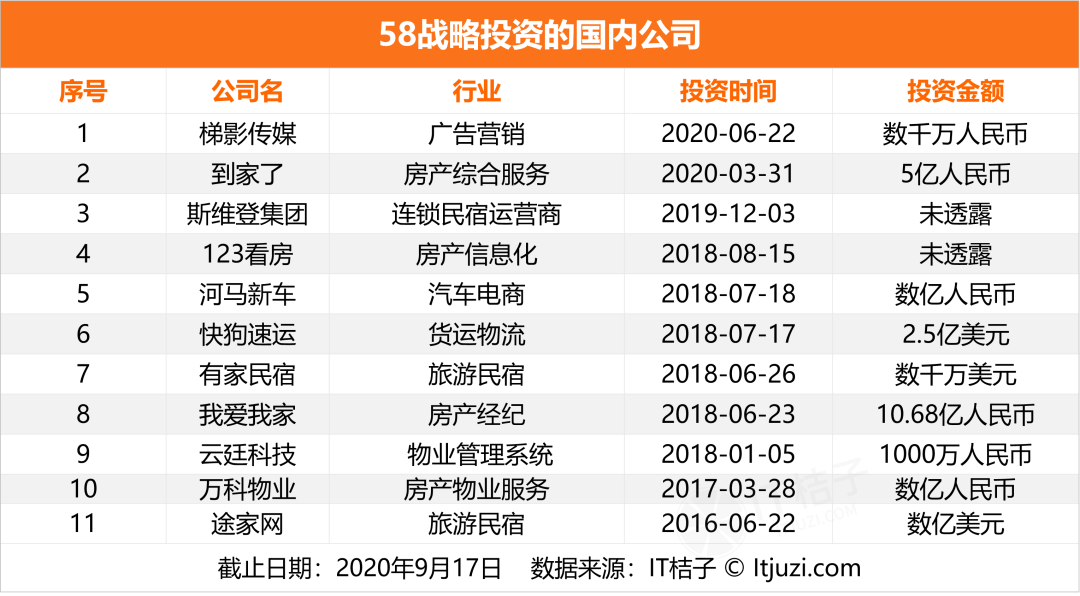 根据 IT 桔子数据统计,58 过往战略投资案例涉足的行业包括房产、汽车、物流和广告营销。