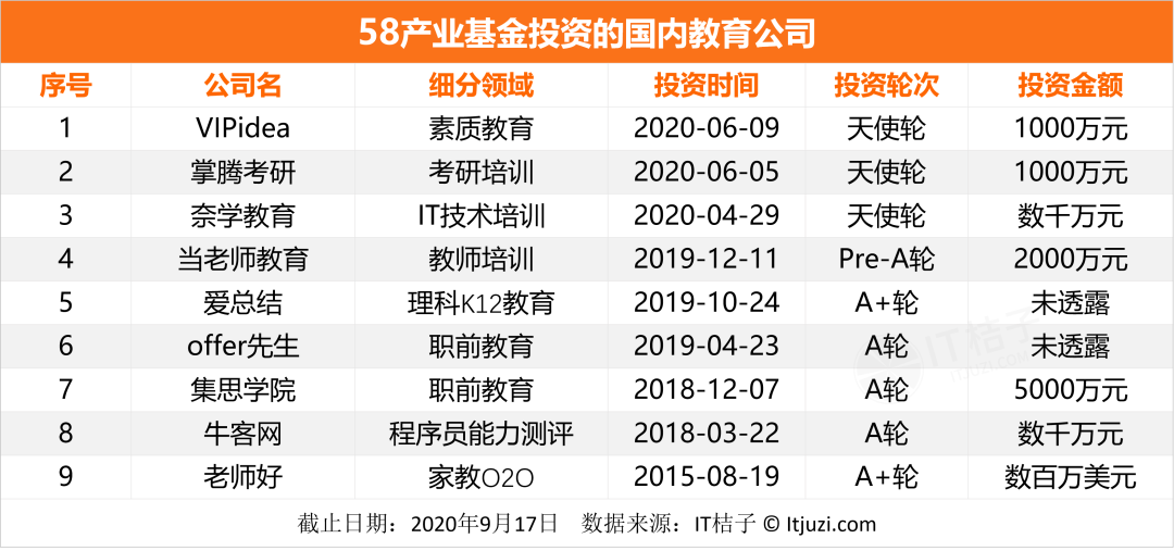 因此 2018 年58设立了产业基金,将主要投资方向锁定在教育和消费,这是之前 58 较少涉及的细分领域。根据 IT 桔子统计,2018 年以前58只投了一个家教 O2O 公司老师好(该公司后来转型为在线课程);2018 年 58 产业基金成立后一共投资了 8 家教育公司;投资轮次均为天使轮和 A 轮。