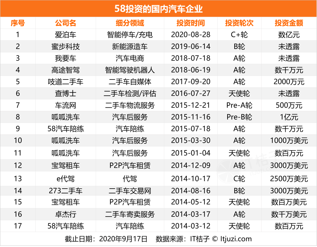 根据 IT 桔子数据,58 投资了呱呱洗车、宝驾租车、e 代驾、273 二手车、卓杰行、车流网、查博士等 13 家公司,涉足二手车、租车、代驾、汽车后市场服务。其中,有几家公司是 58 投资了 2 次以上的,比如 58 汽车陪练(2 次)、宝驾租车(2 次)、呱呱洗车(3 次)。