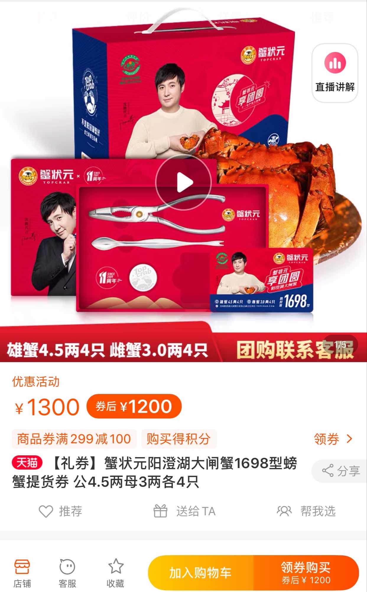 “公4.5两母3两 各4只”的蟹状元大闸蟹礼券,原价1698元,直播间售价849元,“仅”用一半价格,就可以把真正的阳澄湖大闸蟹带回家。