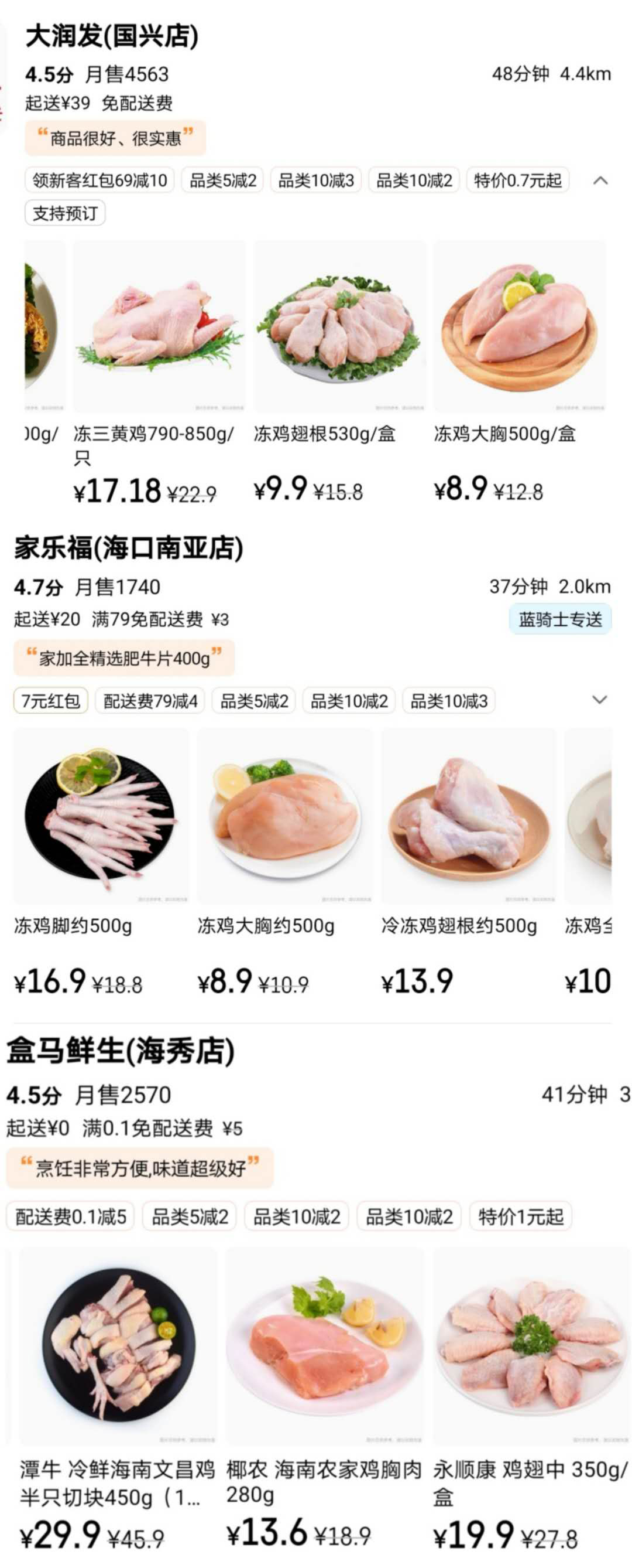 像鸡大胸、鸡翅根等产品,价格基本维稳在10元左右每斤,“我们这8月份以来,鸡大胸卖9.9一斤,海口目前都是这个价。”工作人员表示。