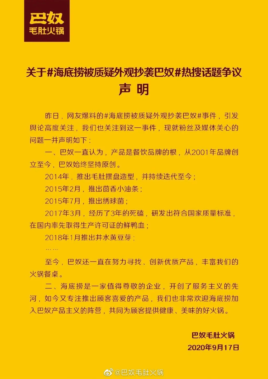 9月17日,巴奴毛肚火锅就被“抄袭”一事发布回应声明,除了公布涉及此次事件的菜品推出时间外,还表示“欢迎海底捞加入巴奴产品主义的阵营,共同为顾客提供健康、美味的好火锅。”