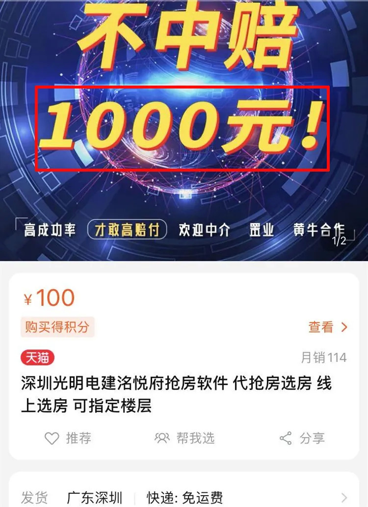 有的抢房中介表示,购房者中意的楼层区间、户型、楼层都可以进行指定,甚至自信满满表示:“你敢抢,我敢赔,不中赔1000元。”还有淘宝店主表示:“只要不是内定名额,保证百分之百抢到房,而且可以同时锁定多套房源。”