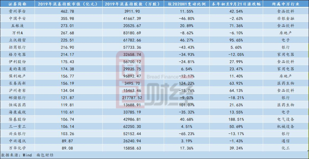 图2:2020年上半年末混合型基金前20大重仓股较2019年年末变动情况