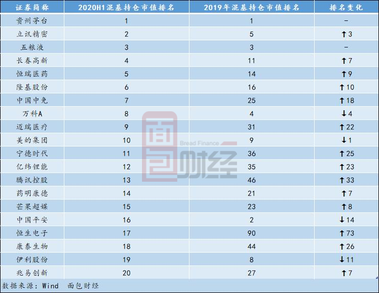 图5:2020年上半年混合型基金前20只重仓股持仓市值排名变动情况