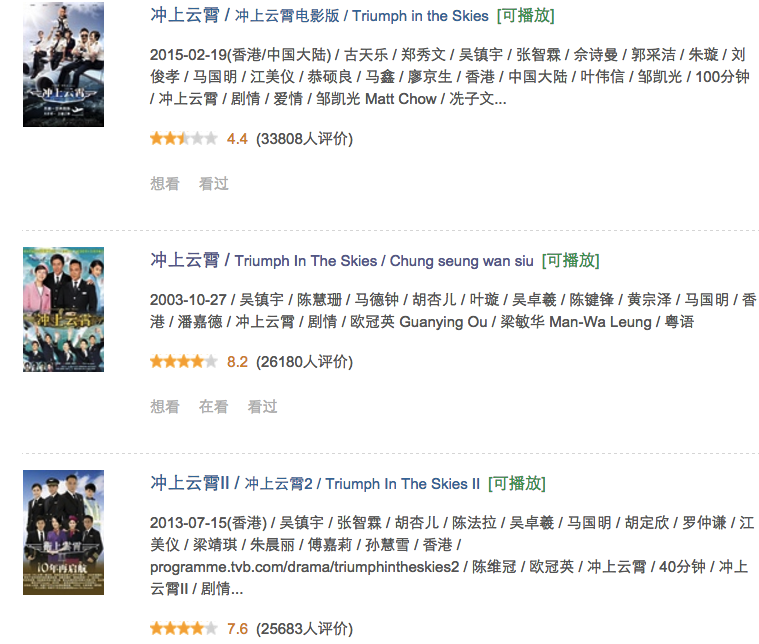 近两年,TVB创作乏力,为促进营收,也开始炒冷饭,积极运作将曾经受欢迎的剧集拍成电影。去年,寰亚电影公司就根据TVB热播剧《冲上云霄》推出了同名大电影。可惜两部剧集在豆瓣上有8.2和7.6的分数,变成电影后就直降为4.4分,不过,票房还算说得过去,最终收获了1.55亿人民币。