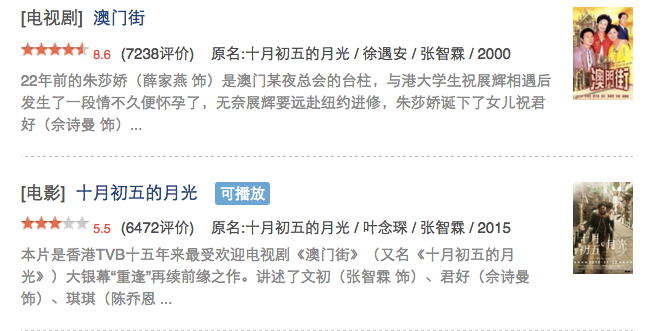 另一部根据2000年的剧集《澳门街》衍生的大电影《十月初五的月光》,电视剧评分8.8,拍成电影后评分仅为5.5,票房则只有四千多万。