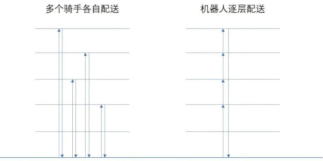 如果这时,能够有一台室内配送机器人,将这些外卖归集到一起,接下来再通过电梯或楼梯依次配送给每个用户,考虑到多人等电梯的时间损耗,这样的方案可能会更优: