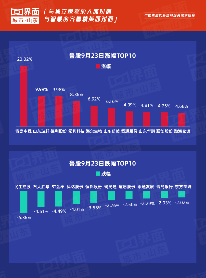 9月23日,山东128股上涨,79股下跌,青岛中程涨停。