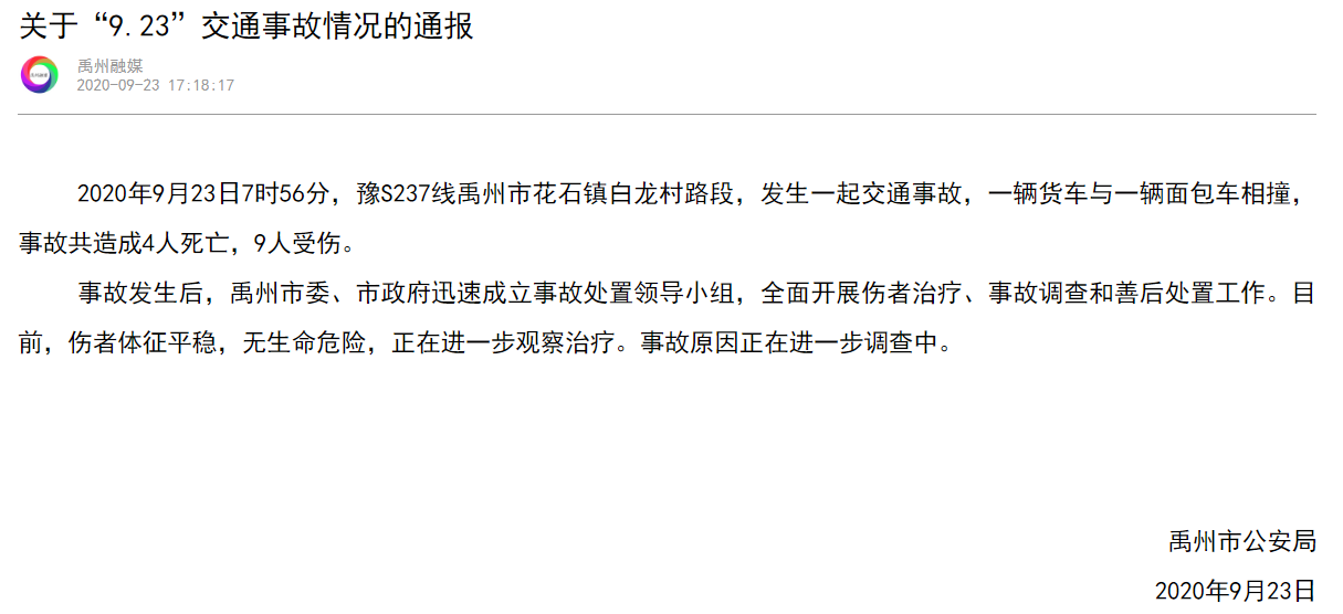 据河南禹州市公安局通报,9月23日7时56分,豫S237线禹州市花石镇白龙村路段,发生一起交通事故,一辆货车与一辆面包车相撞,事故共造成4人死亡,9人受伤。