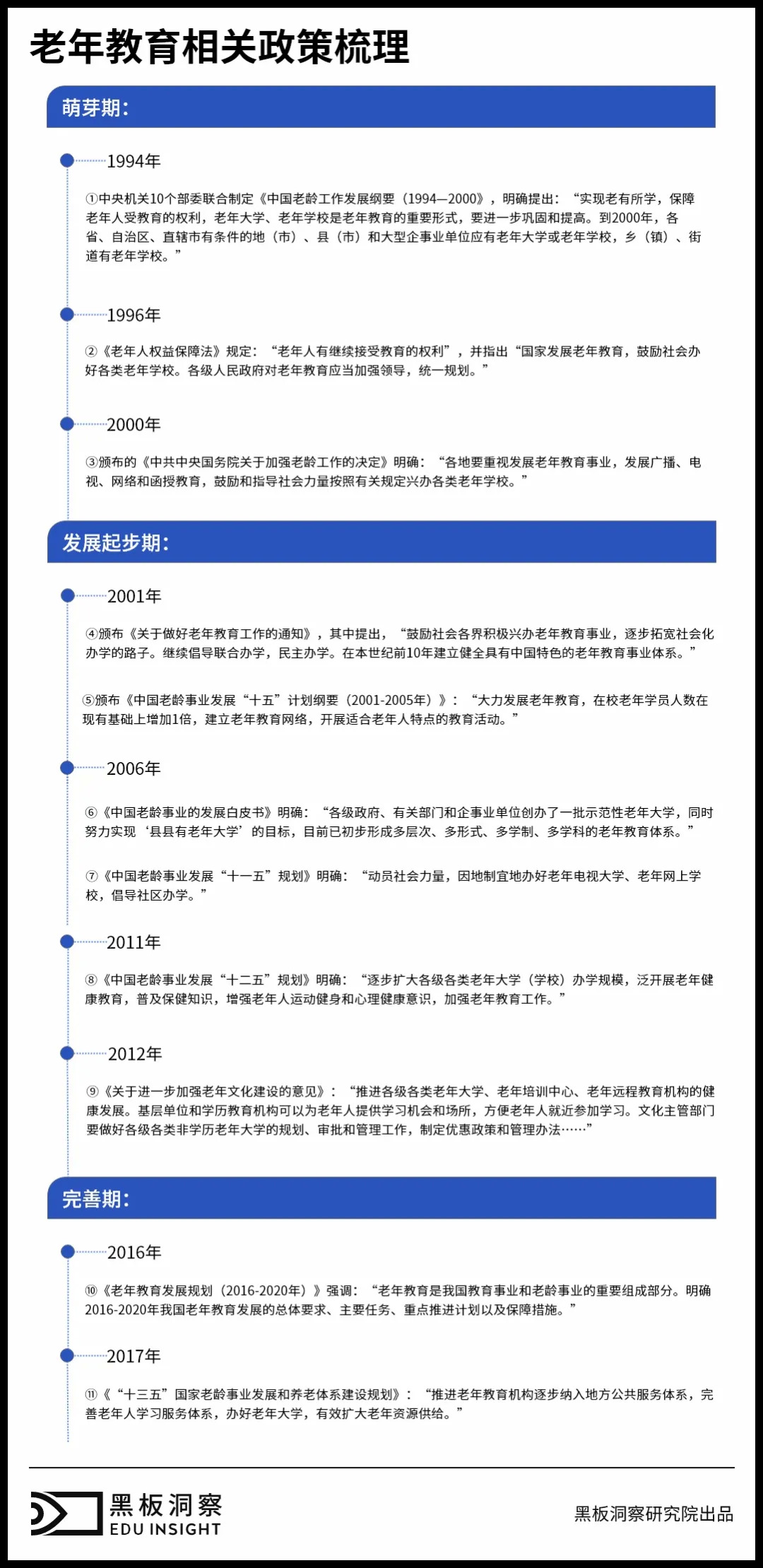 按照时间顺序划分,我国老年教育政策可以划分为三个时期。2000年以前是萌芽期,这一阶段只是在相关老龄事业发展文件中提及老年教育,没有专门的关于老年教育的政策法规,也没有对老年教育的形式、内容、体制等做具体规定。2001- 2015 年是发展起步期,这一阶段的老年教育政策较先前有了更深入和具体的阐述,并且开始有关于老年教育的专门政策。2016年至今是完善期,不仅有了老年教育的发展规划,还对老年教育工作的内容、机制、保障等方面都做了具体规定。