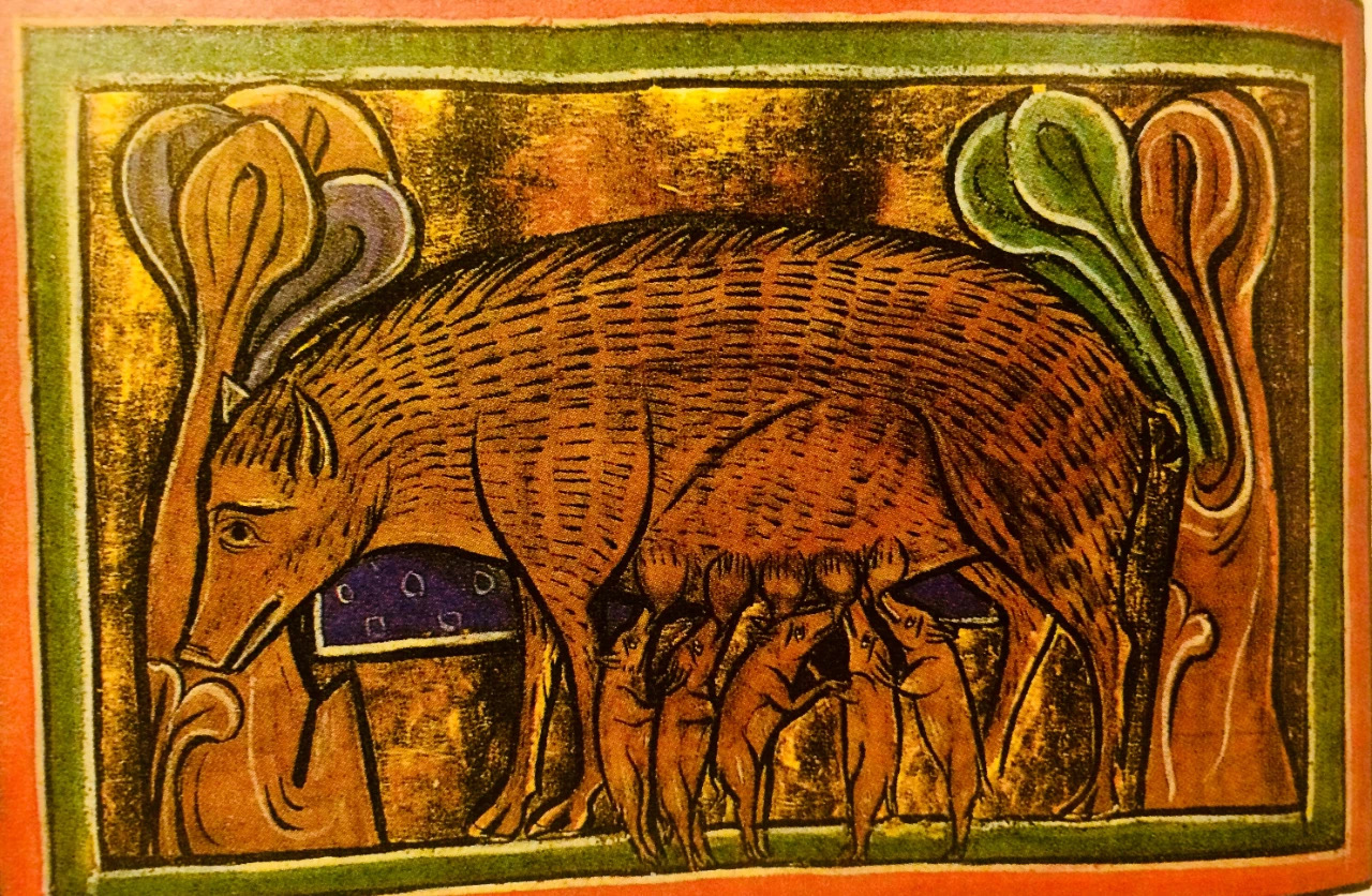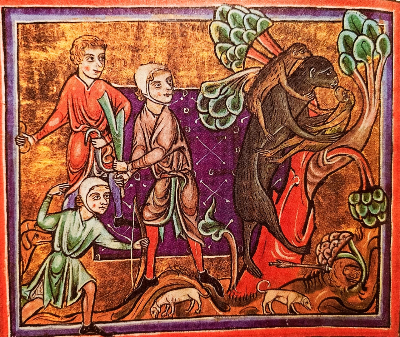 许多中世纪人相信猴子擅长模仿人类,其心情和行为受月相影响——月盈猴喜,月亏猴悲——并由此发展出一套关于猴子具有双重性格的理论。倘若一只母猴生了双胞胎,人们相信它会偏爱其中一只而憎恨另一只,当她被狩猎者追捕逃命时,就把偏爱的小猴抱在怀里,把不受待见的小猴扛在背上——体力不支时,怀里的宠儿往往会摔落在地,背上那只紧紧抓住母猴的猴崽反而死里逃生。九世纪爱尔兰神学家埃里金纳认为,母猴的这种行为模式是人类习性的一则寓言:怀里的小猴代表世俗快乐,越想抓越抓不住,背上的小猴代表精神美德,紧要关头不离不弃。在埃里金纳看来,“世界是一场盛大的神显”,所有动物的形象都是“上帝之指”在尘世所写的巨书中的范例。在动物寓言集之外,“偏袒的母猴”也是时辰书、颂诗集等中世纪手稿页缘涂鸦中备受欢迎的主题。