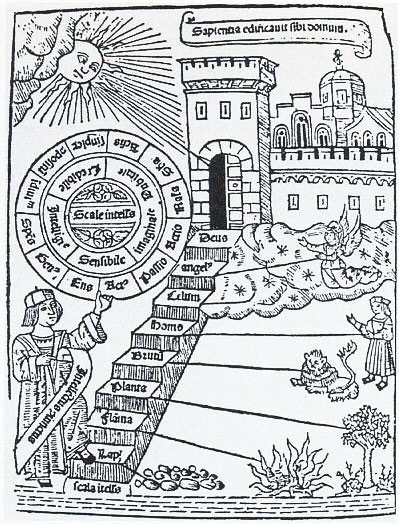 不妨先来看一下动物在中世纪人宇宙观中的地位。动物被称作中世纪“无处不在的他者”。一种始于亚里士多德而盛行于整个中世纪、影响直达启蒙时代及之后的赋予宇宙以结构的譬喻,将从灰尘到神的万事万物都不间断地串联起来,那就是“存在之巨链”或称“自然之梯”(scala naturae)。基于充盈性、连续性和递进性这三大原则,“存在之巨链”为宇宙中的一切造物安排了恰如其分的位置,默认能够存在的一切都已经存在,各自按其属性从高到低紧密排列在一条观念的锁链上,“大自然不会跳步走路”(Natura non facit saltum)。这种等级完备的谱系学非常贴合中世纪人深信神造的一切都已各就各位的心理需求,同时还串联起微观和宏观两种思维模式:微观上,锁链或阶梯上相邻的两者间互相依存,差异甚小(甚至可以忽略不计);宏观上,神圣者、人类、动物、植物、矿物等大类之间的分界真实不虚——动物的地位居中,与植物分有生命,与人类分有感受力和欲望,却缺乏人类的理性。亚里士多德《动物史》(Historia Animalium)里的看法对上述中世纪动物观产生了深远影响:“整个[植物]界与其他物体相比,或多或少总显得有生命,但与动物界相比却显得没有生命。从植物到动物的变化是连续不断的。”这种观点实际上在中世纪十分普遍。以动物界为中位,巨链向下串起动物和植物的关系——正如在动物寓言集和草药书中有时能看见非常相似的对其物理属性或生命秉性的描述,部分植物亦被描绘成具有动物的感受力,甚至以动物的方式繁殖(比如寓言集中常见的“绵羊树”);向上则串起动物和人类的关系,在寓言集中表现为:动物的行为习惯是人类道德境界的一个不完全的缩影(猿猴是这方面的典范),或是《圣经》中所记载的神学事件的一个苍白的预表。