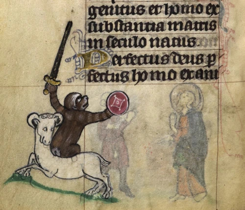 作为现存插图最完整的产于英格兰的动物寓言集之一,抄本764中“猴”的条目下以拉丁文白纸黑字写着:“猴和猿的唯一区别在于猴有尾巴。”若以这条标准看,出现在大部分页缘的猴子形象实际上是猿。在对林奈分类法一无所知的中世纪动物图鉴中,两者常被当作一种动物对待,包括狒狒也是。抄本764对狒狒的记载是:“它们常见于埃塞俄比亚,跳得非常远,咬起人来毫不留情,永远无法被驯服,野性十足。”埃塞俄比亚对大多数中世纪英国人来说是不可能涉足的蛮荒之地,而将传说与经验、书本知识与观察所得当作同一类事实并置,这是典型的中世纪博物志的写作方法。抄本764还指出拉丁文“猿猴”(simius)的希腊词源意为“鼻孔挤在一起”(虽然伊西多尔的《词源学》认为这个词起于“模仿”一词,该解释很可能更接近真相),并补充道:“它们的鼻孔确实挤在一起,面容可怕,充满褶皱,形如风箱;而且,母山羊也有一样的鼻孔。”且不论此处“而且”的行文逻辑,页缘装饰中猿猴的形象的确经常和山羊并肩出现,两者都被认为生性淫乱。比如下页这张出自十四世纪初尼德兰《马斯特里希特时辰书》的页缘画中,山羊背上的猴骑士正向上方《阿塔纳修信经》中“完美的上帝,完美的人”这两行文字挥舞着剑和盾,猴子和山羊满脸戏谑和挑衅,对其理应提供图注的文本形成了反讽和颠覆的威胁。许多彩绘动物寓言集都包含这种内在不稳定性:图像时常在读者预期能够更直观地传递文本所指、帮助强化训谕之处意外地削弱、质疑、胳肢着文本,令原本确凿的教义变得触痒不禁。这种文本与图像拔河角力,直至一方濒临瓦解的情况也造成了研究着力不均的困境。现代学者往往不是把寓言集或页缘画中的动物当作纯装饰作品来描述,就是将既定的宗教文本仅作为古文书学的训诂对象,而对图文之间危险而迷人的张力鲜有深入。