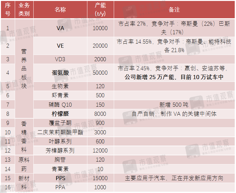 新和成作为世界四大维生素生产企业之一、国内龙头,其主营以营养品和香精香料业务为主,新开发了高分子新材料和原料药业务,共四大板块,市值观察收集年报及相关资料将各板块信息罗列如下: