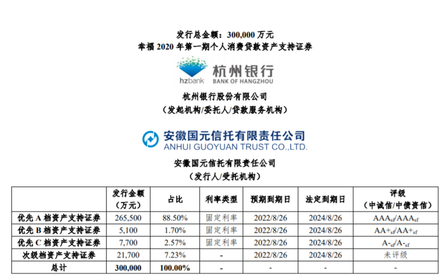 近日,杭州银行披露了“幸福2020年第一期个人消费贷款资产支持证券”说明书,该产品的基础资产为杭州银行向个人发放的用于消费的消费贷款。