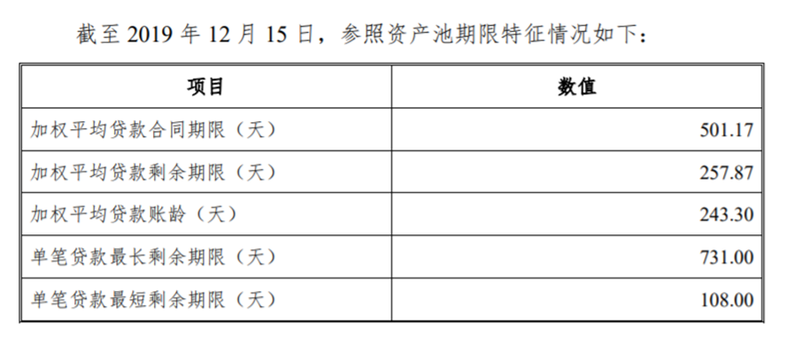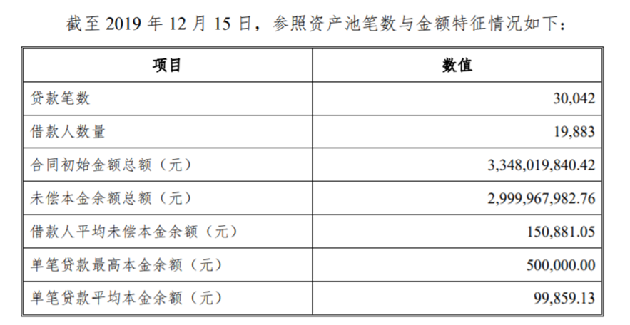 发行说明书显示,基础资产池中初始未偿本金余额为29.99亿元,入池资产总笔数为30042笔,平均单笔未偿本金余额9.99万元,加权平均贷款期限501天,加权平均剩余期限258天。