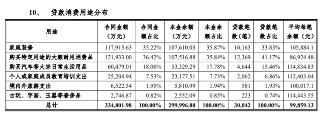 从贷款用途看,家庭装修本金余额占比35.87%;购买大额耐用消费品占比35.84%;买车等日常生活用品本金余额占比17.78%。
