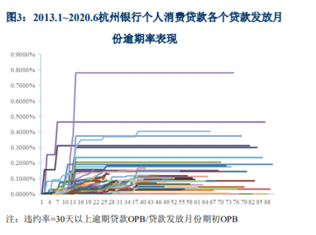 逾期率方面,杭州银行提供的静态池历史数据显示,自2013年1月至2020年6月发放的贷款30天以上逾期数据最高不到0.8%,大都低于0.5%。