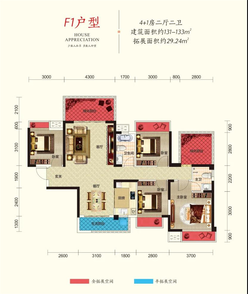 大境全能五房,建面约131-133㎡F1户型,聚餐会客多重空间,二胎时代、三世同堂从容惬意,拓展面积约29㎡,多得一间房,随心打造,随心所享。室室飘窗、南北通透双阳台,阳光、清风轻松入室。