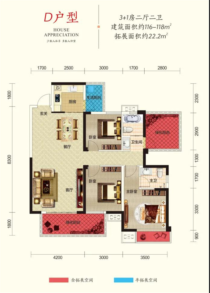轻奢品质四房,建面约116-118㎡D户型,四室两厅悦享人生,明亮的阔景双阳台,引景入室。三开间朝南,鲜氧清风畅游室内。拓展面积约22㎡,多一间房,多一份享受。