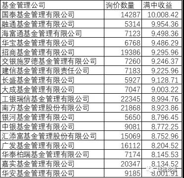 最后,我们把所有基金公司都统计一遍,在所有公募基金中,询价数量在5000次以上,同时“满中收益”在8000万以上的公司,一共18家: