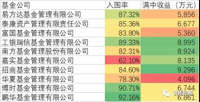 嘉实尽管入围率只有62%,垫底,但满中收益高达8135万元,排名第四,彰显效率,保大弃小策略奏效。满中收益第一的招商基金,中签率仅排在第六。易方达空有87%的入围率,满中收益仅有不到6000万元。