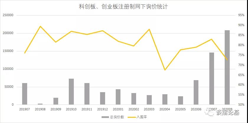 自科创板开板以来,虽然几有波折,但打新收益还是相当可观的,尤其是7月份上市的几个大家伙,点燃了整个市场的打新热情,参与网下打新的产品愈来愈多,8月份刚过半,全市场询价数量已达到20万。比科创板开板以来任何一个月份都多。
