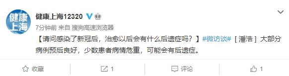 据上海卫健委官微“健康上海12320”9月24日消息,有市民问,感染了新冠后,治愈以后会有什么后遗症吗?对此,上海市疾病预防控制中心传防所急传科主任潘浩表示,大部分病例预后良好,少数患者病情危重,可能会有后遗症。