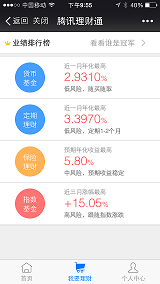 目前,理财通对接的金融产品囊括货币基金、定期理财、保险理财和指数基金四大类风险和收益高低不同的多种产品。货币基金包括易方达基金易理财、广发基金天天红、汇添富基金全额宝、华夏基金财富宝;定期理财包括民生加银理财月度、招商招利月度理财、银华双月理财;保险理财包括光大永明定活保66、光大永明定活保168、国寿嘉年保险理财;指数基金包括易方达沪深300ETF联接、嘉实沪深300ETF联接、工银沪深300指数、南方中证500ETF联接、华夏沪港通恒生ETF联接、易方达恒生中国企业ETF联接。