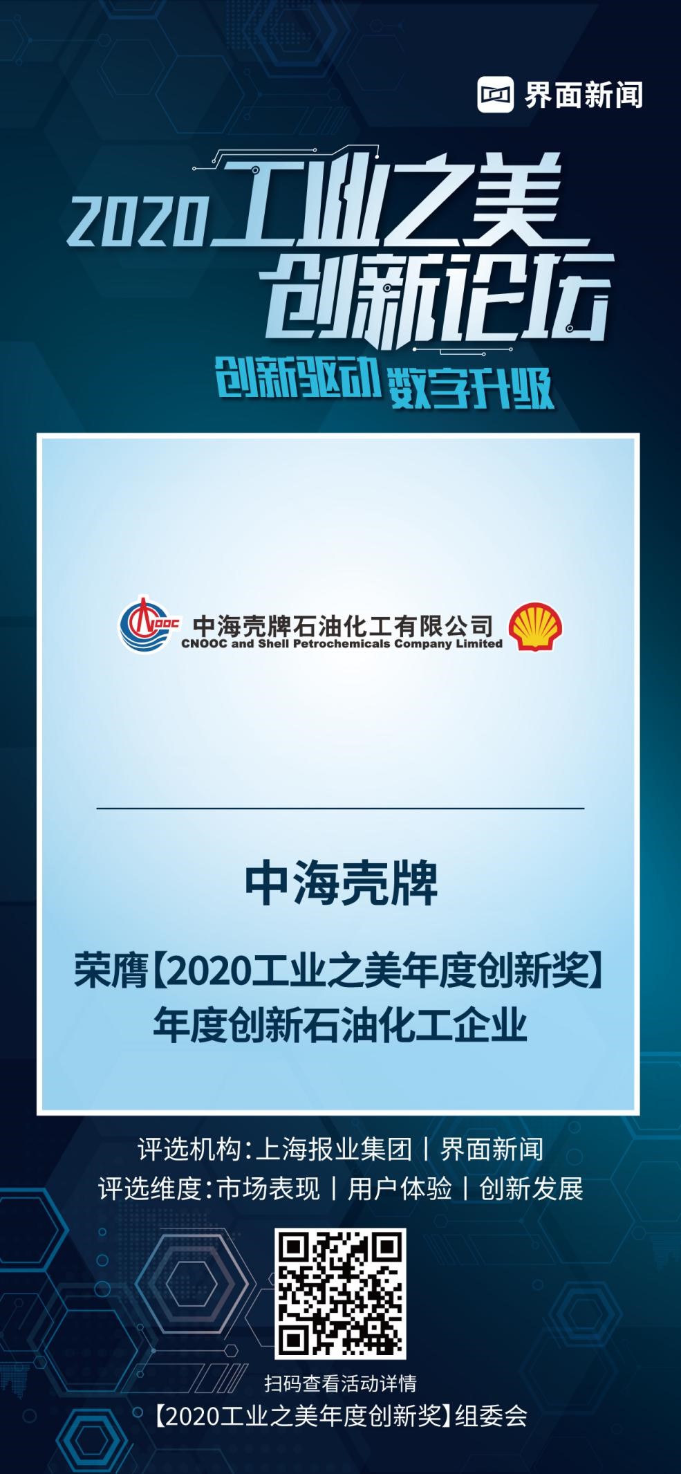9月25日,上海报业集团l界面新闻揭晓 2020【工业之美年度创新奖】终榜,正式公布了本年度获奖名单。聚焦数字化时代的产品升级及变化,来自于物联网、能源、通信等领域优秀企业和产品,夺得了20项年度大奖。中海壳牌凭借其行业领先的技术和先进的管理模式荣膺年度创新石油化工企业。