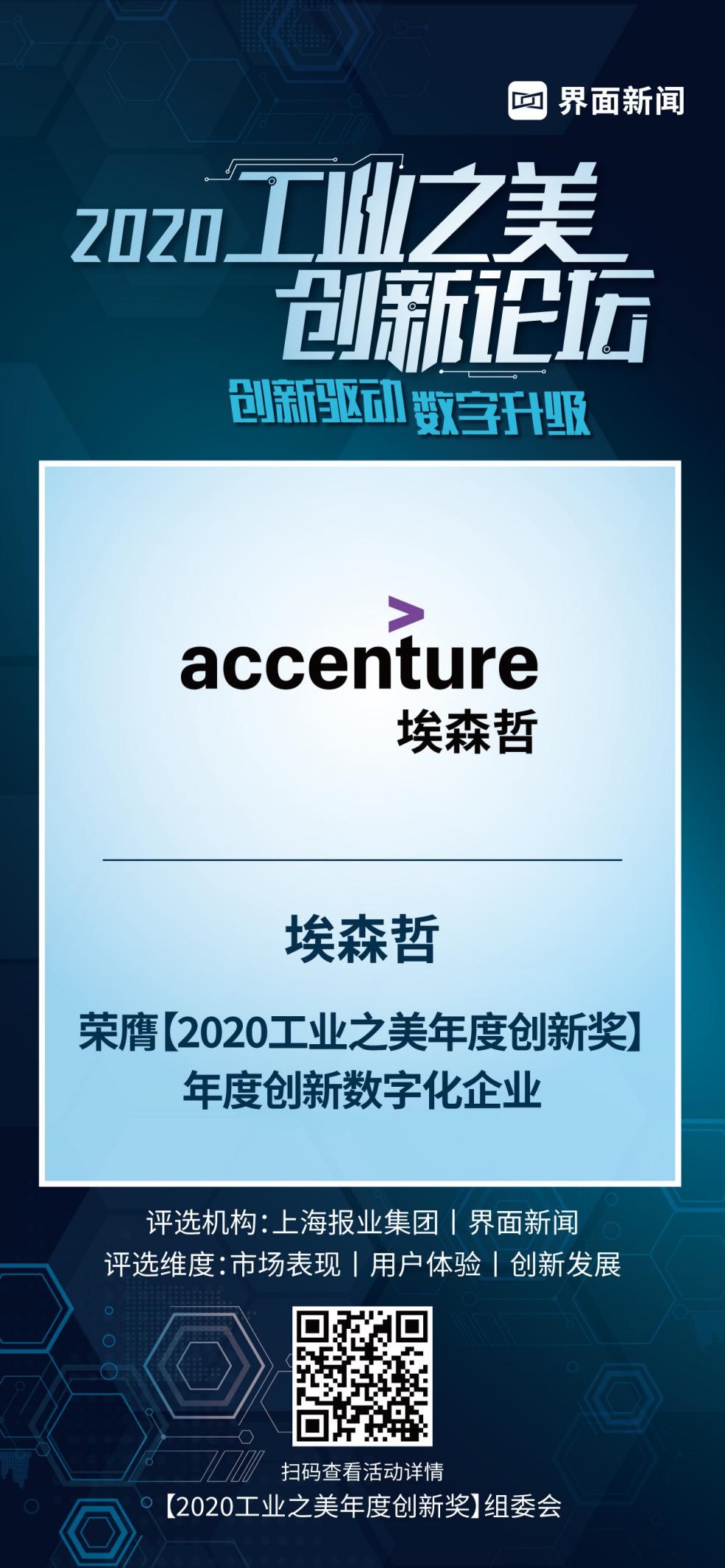 9月25日,上海报业集团l界面新闻揭晓 2020【工业之美年度创新奖】终榜,正式公布了本年度获奖名单。聚焦数字化时代的产品升级及变化,来自于物联网、能源、通信等领域优秀企业和产品,夺得了20项年度大奖。埃森哲凭借其卓越的数字化能力荣膺年度创新数字化企业。