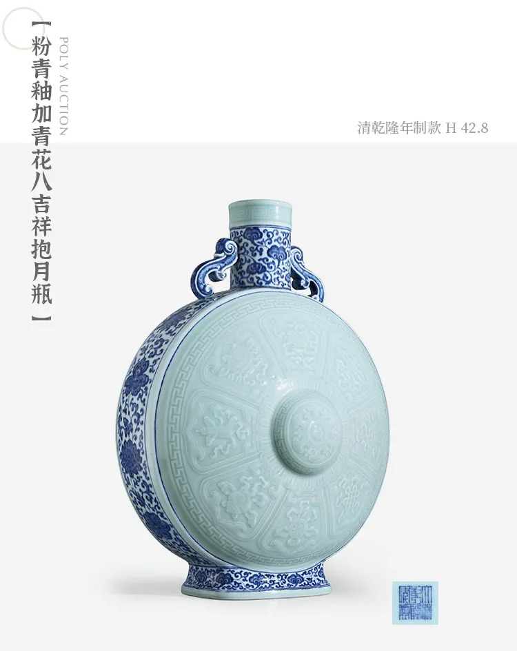 整器造型宏伟,依遵乾隆皇帝之广博爱好,以多种釉彩相结合,极良工巧匠之能事,华丽典雅,令人赞叹。底部亦施青釉,落青花“大清乾隆年制”六字篆书款。