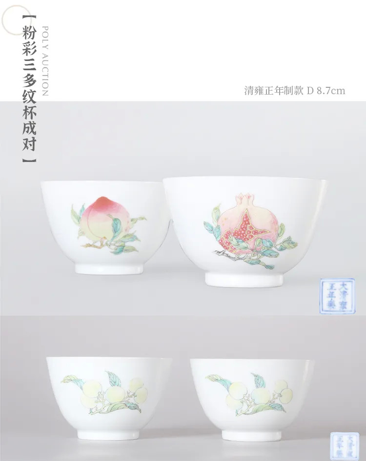 雍正帝喜爱吉祥纹饰,见于其日常所用。本品石榴多子,象征子孙兴旺;西王母寿桃三千年开花、三千年结果,祝愿长寿;枇杷佳果,形似琵琶,色泽金黄,寓意丰盛吉祥。