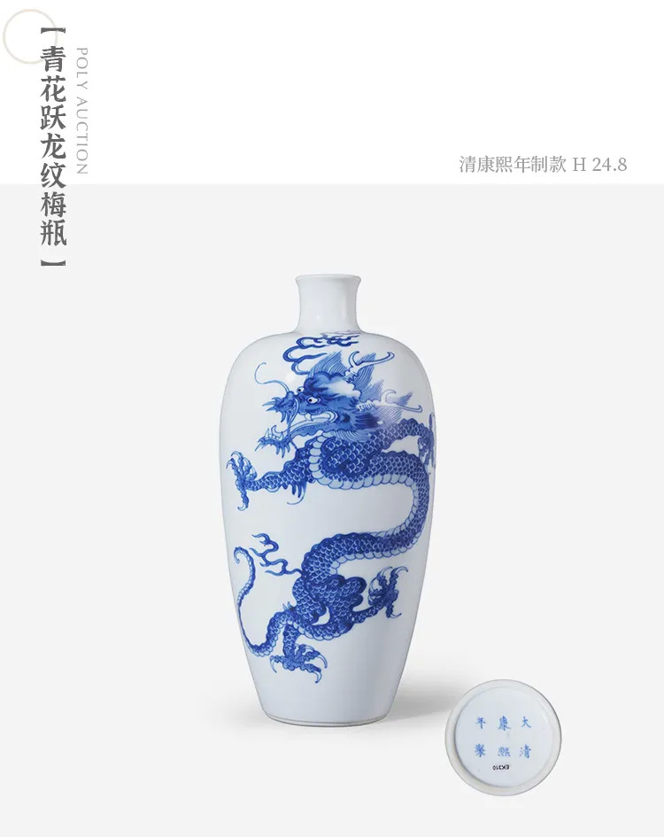 瓷胎坚致细腻,釉面洁白光润,纹饰简洁静雅,外壁仅绘制龙赶珠纹,龙纹下颚兜齿,牙爪锋利,毛发飞扬追赶火珠,威风凛凛。