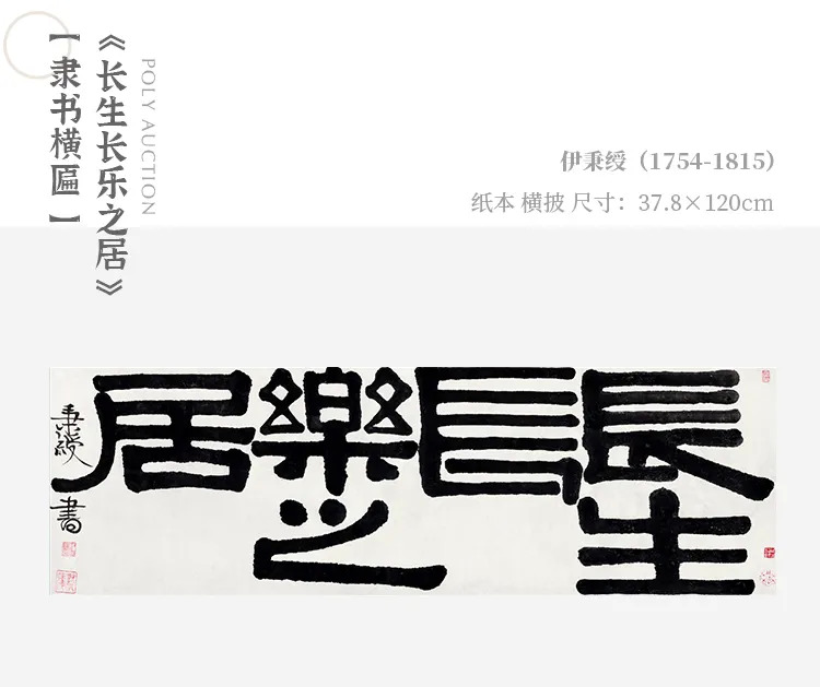 《长生长乐之居》展现伊秉绶特别擅长的笔画减省,以直线、弧线、圆点进行组合创造,用笔以宽壮取胜,力量一以贯之,笔画平正而不刻板,巧于留白,大大增加了空间的趣味。