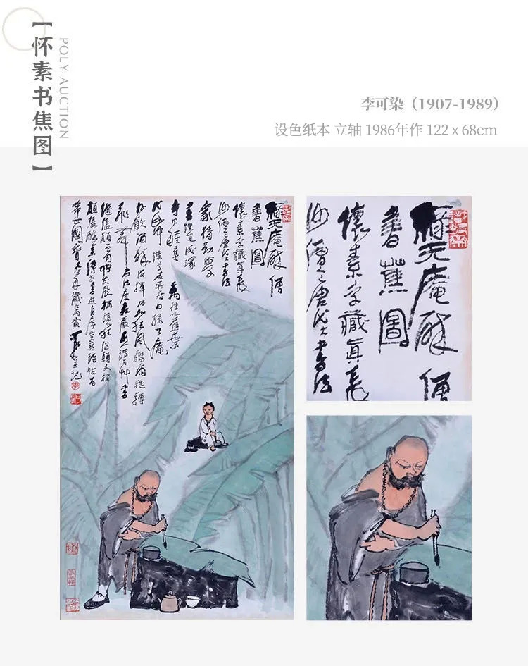 《怀素书焦图》是李可染先生描绘怀素种蕉学书的故事,所画的怀素,颇似鲁智深,笔墨放浪,形象奇古,站立悬臂,秉笔书蕉,一副法度森严的样子。