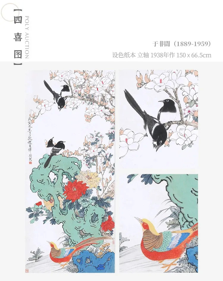 《四喜图》于非闇拟北宋画家赵昌笔意、而实出己貌的工笔花鸟精品。画家将牡丹、玉兰、海棠、喜鹊、锦鸡、太湖石共聚一轴,代表玉堂富贵、添喜长寿,寓意吉祥美好。
