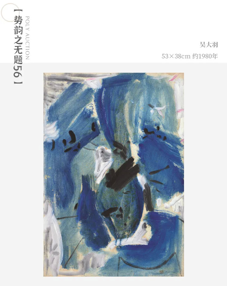 《无题56》,是吴大羽成熟时期艺术创作的特点集大成之作。作品以蓝、白色调为主,在间以黑色在画面上穿插,辅以极少生动的暖色作为调剂的色彩构成关系中,探索画面的势象表现和张力关系。