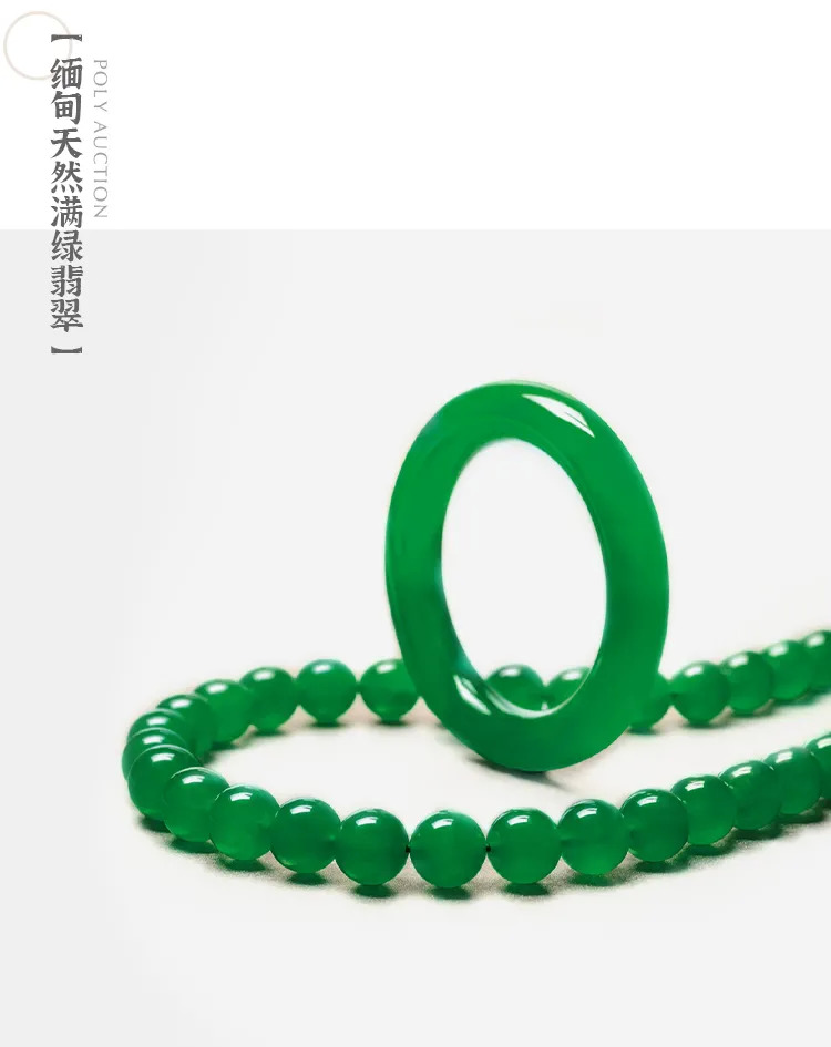雕琢翡翠向来“以素为贵”,而浑圆晶莹的玉珠正能表现上乘玉质的美感。颜色浓而不悍、柔而不薄、润而不腻,堪称郁绿柔亮,在透光下,那一抹柔润艳丽的绿意让人不禁陶醉。