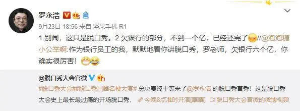 9月23日,“老一辈人民艺术家”罗永浩先生终于完成了他的脱口秀首秀。在综艺节目《脱口秀大会》上,老罗高调宣布,自己所欠的6亿债务已经还了4亿,剩下的预计一年内还清。