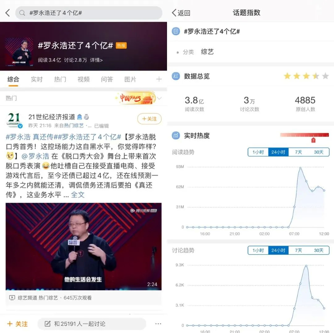 相关言论一出,立马上了微博热搜。有网友表示支持,“敢于承担责任,老罗是条汉子”;也有网友质疑称,“凭带货半年挣4亿?老罗又在忽悠了”。