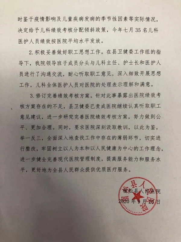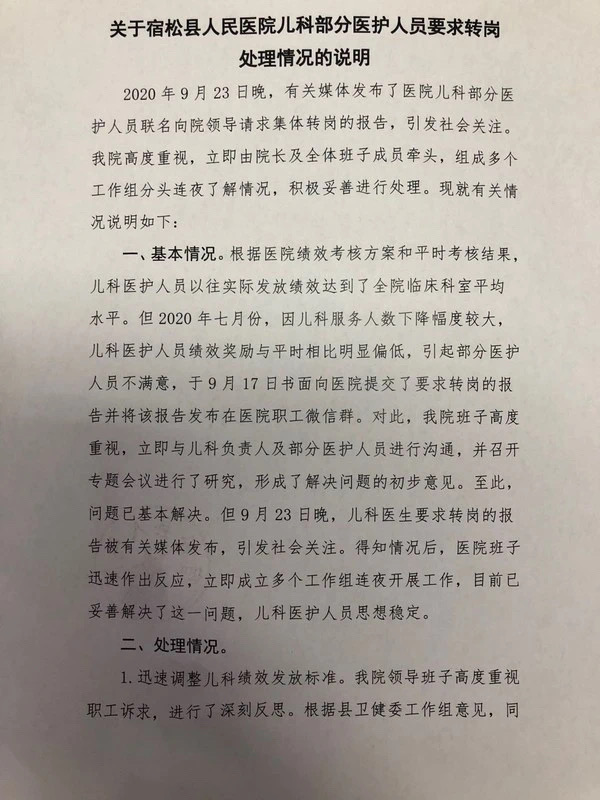 而9月25日,宿松县人民医院针对此事也发布了《情况说明》。《说明》称,2020年七月份,因儿科服务人数下降幅度较大,儿科医护人员绩效奖励与平时相比明显偏低,引起部分医护人员不满意,于9月17日书面向医院提交了要求转岗的报告并将该报告发布在医院职工微信群。