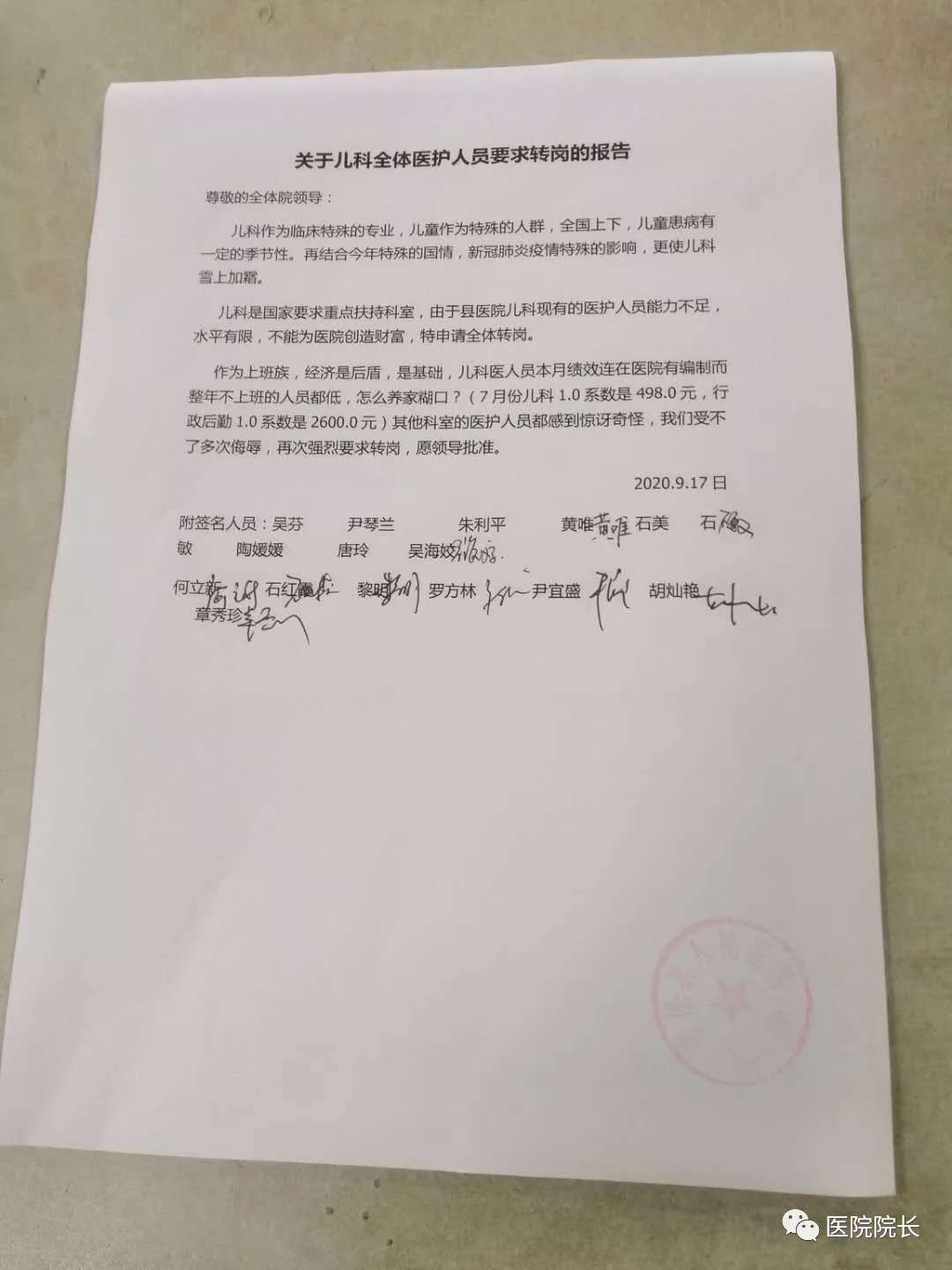 9月17日,微信公众号“医院院长”曝光了宿松县人民医院的10名儿科医护人员向全体院领导递交了一份要求转岗的报告。报告中写道,该院儿科医护人员月绩效比在医院有编制而整年不上班的人员还要低(7月份儿科1.0系数是498.0元,行政后勤1.0系数是2600.0元)。报告言辞激烈,称“受不了多次侮辱,再次强烈要求转岗。”