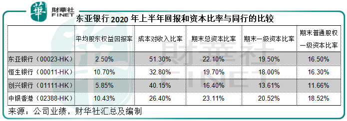 见下图,对比于恒生银行、创兴银行和中银香港,2020年上半年东亚银行的平均股东权益回报率最低,只有2.5%,而成本对收入比率最高,达到51.30%,可见其成本确实有改善需求和空间。