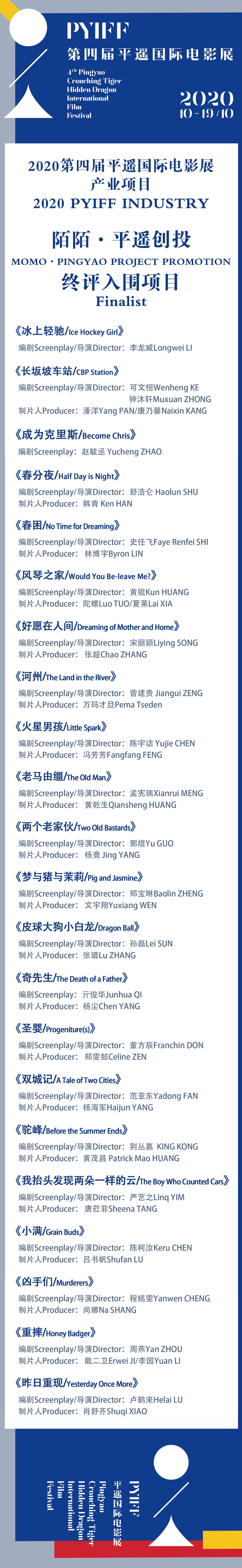 9月24日,2020第四届平遥国际电影展正式公布本届电影展产业板块入围项目。“发展中电影计划(WIP)”单元共有17个处于发展制作中的电影项目入围;“陌陌·平遥创投(PPP)”单元则揭晓了22个终评入围项目。