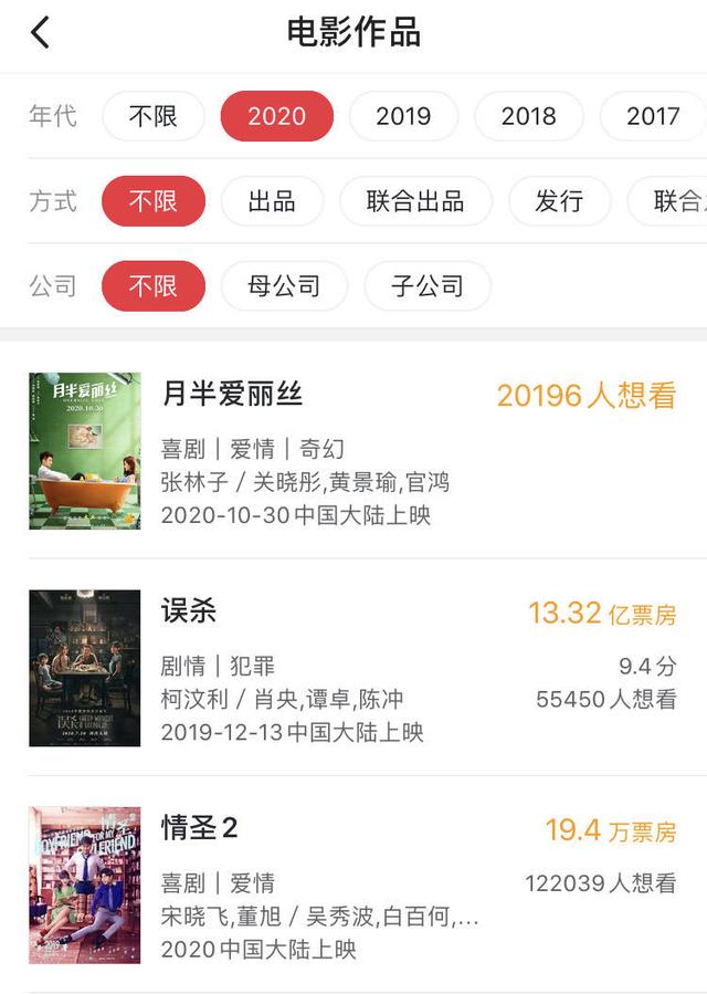 相比这些公司的布局,万达电影2020年显得尤为沉默,能够听得见响声的举动,是重映的《误杀2》又掀起一波观影热潮。现在公开信息中,万达2020年上映的电影是一部中小成本爱情片《月半爱丽丝》,定档10月30日。