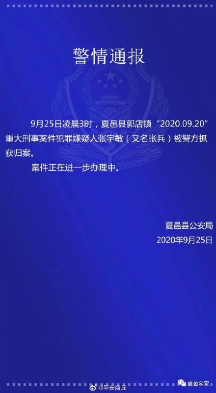 据河南省商丘市夏邑县公安局通报,9月25日凌晨3时,夏邑县郭店镇“2020.09.20”重大刑事案件犯罪嫌疑人张宇敏(又名张兵)被警方抓获归案。案件正在进一步办理中。