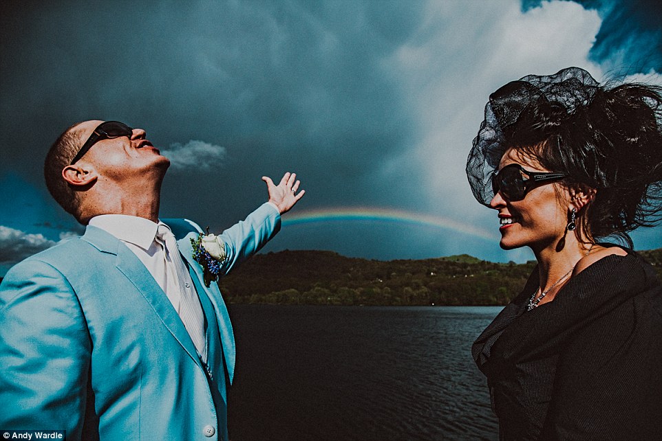 这张照片是摄影师安迪·瓦德尔(Andy Wardle)所拍的一张得意之作。在温迪和詹姆斯的婚礼中,一道彩虹出现在湖区(The Lake District)的温德米尔镇(Windermere)附近。